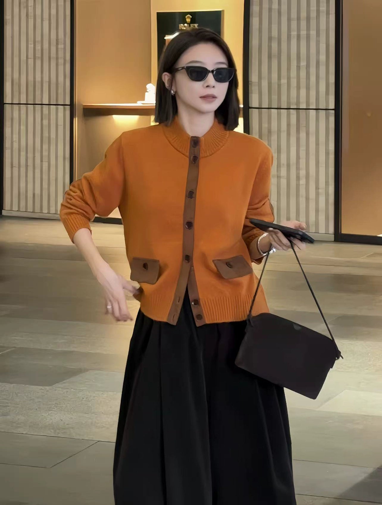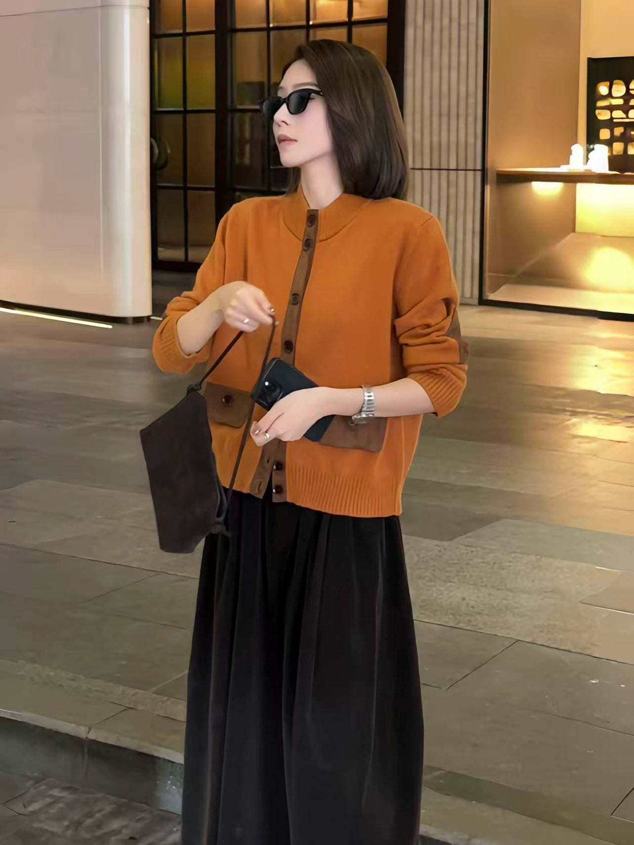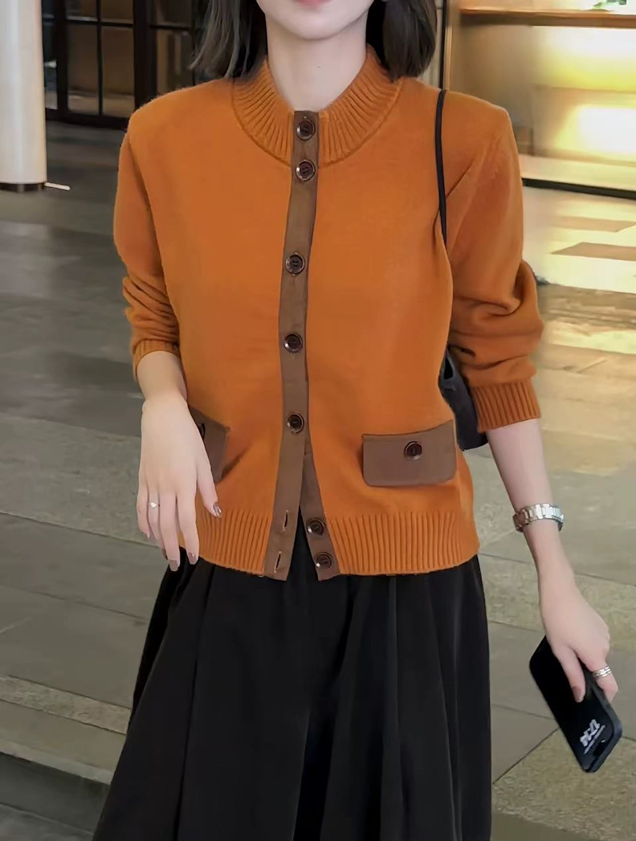 A minimal knit cardigan featuring contrast patch pockets and a relaxed silhouette. Soft texture and effortless layering piece for everyday modern looks.