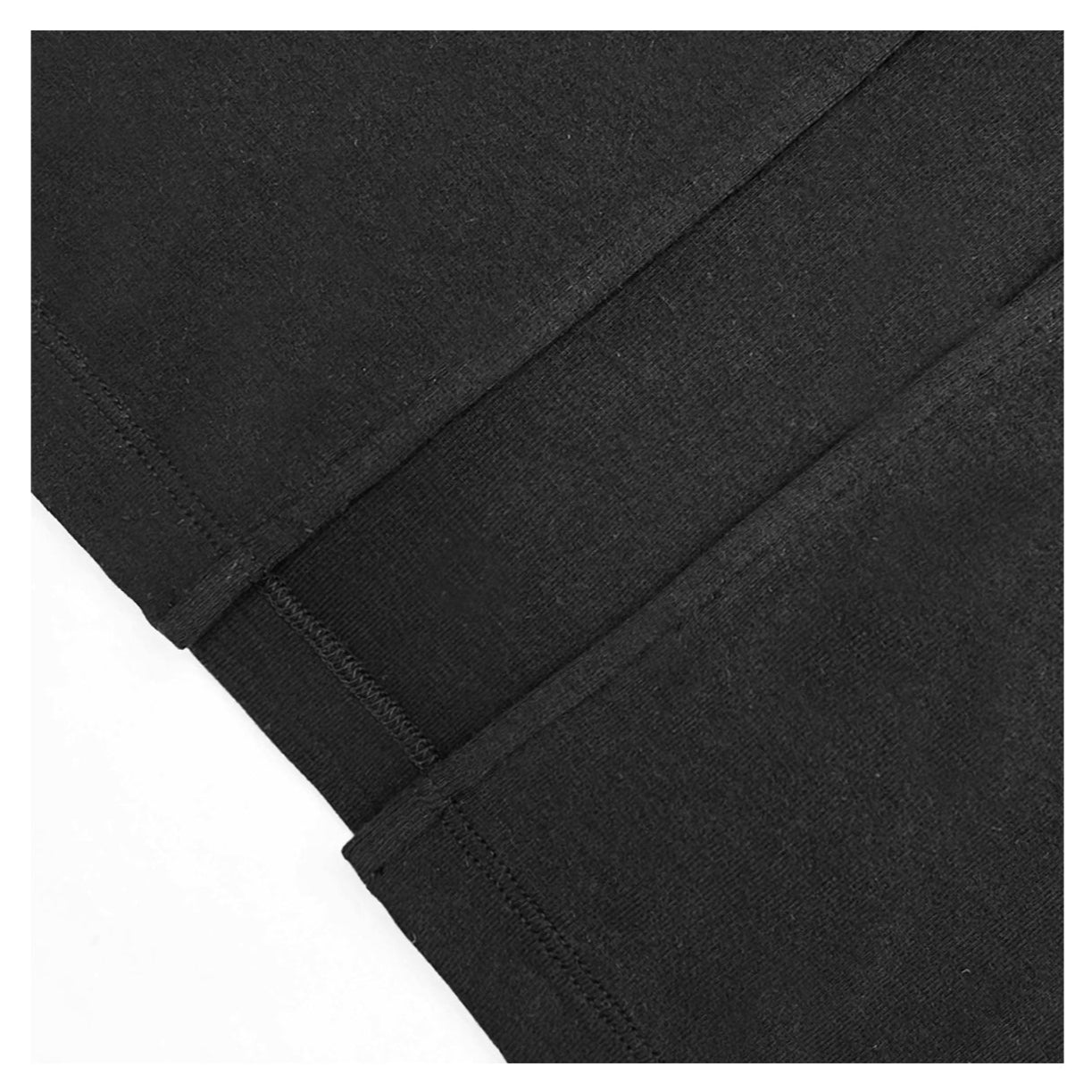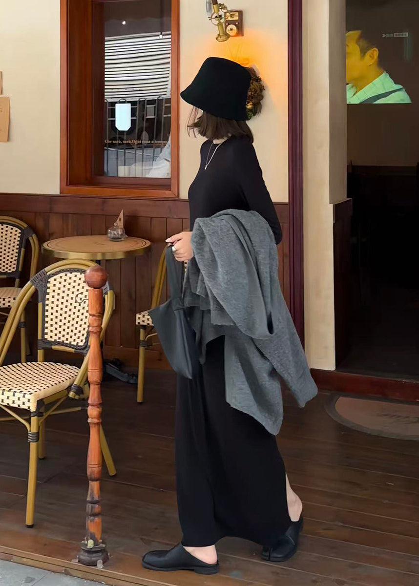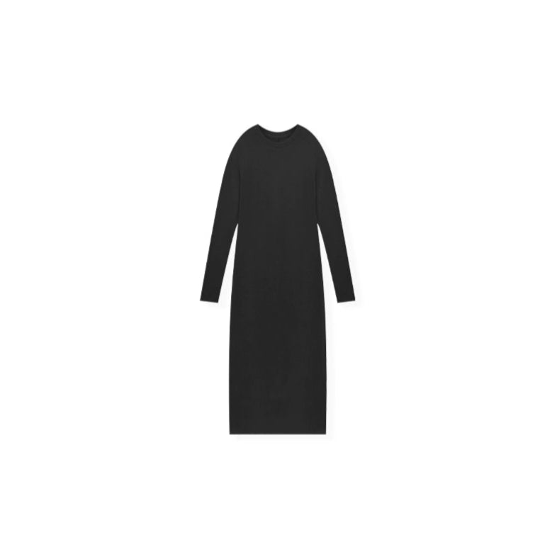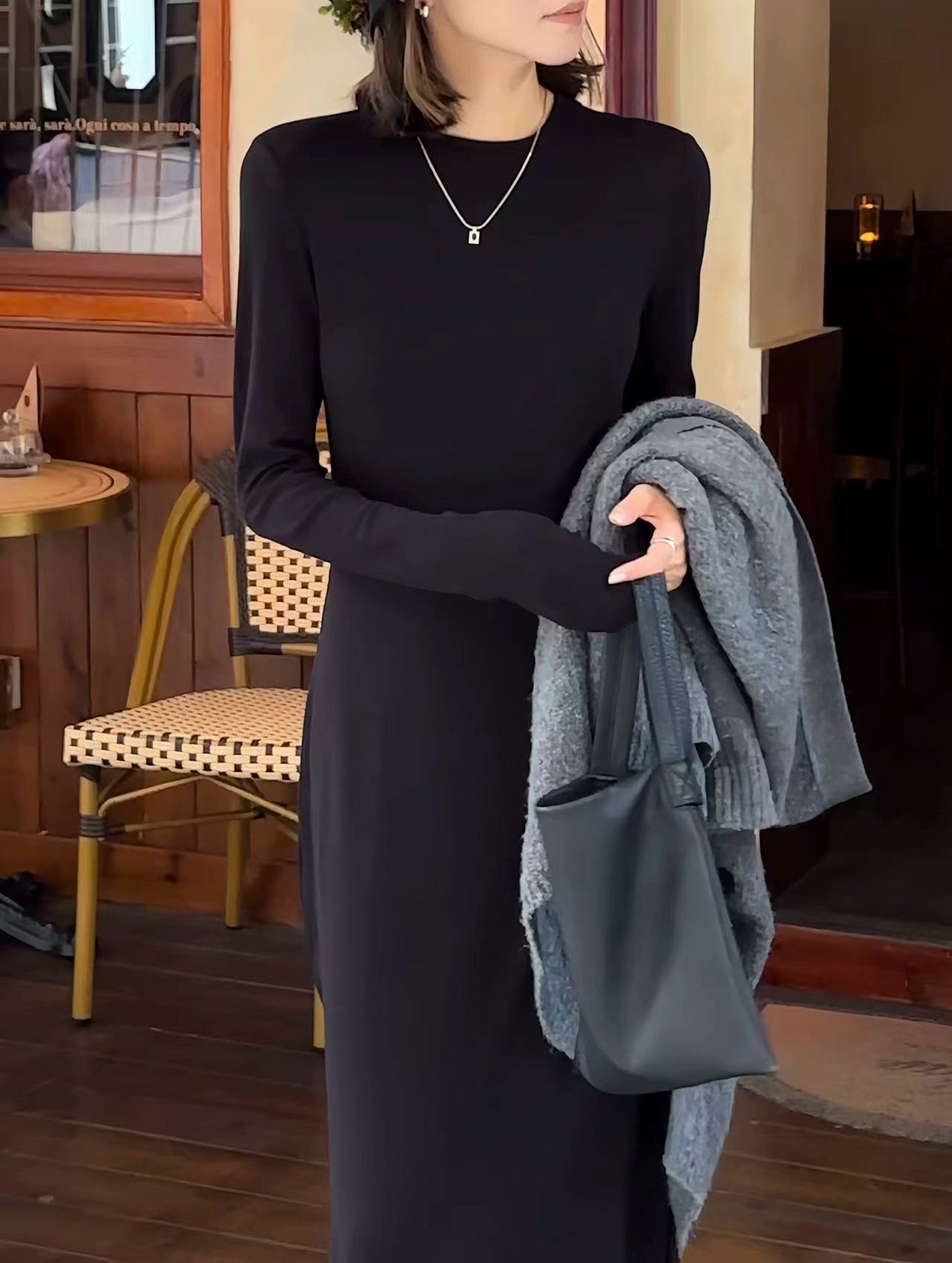 A sleek minimalist black knit dress featuring long sleeves and a flattering side slit. Designed for an elegant, slimming silhouette, perfect for versatile day-to-night styling.